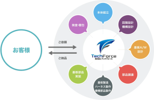 テックフォースでは、過去に培ったノウハウをもとに、製品化実現へ各業者との綿密な打ち合わせをお引き受けさせていただき、お客様の状況や要望に寄り添ったモノづくりのご提案をさせていただきます。